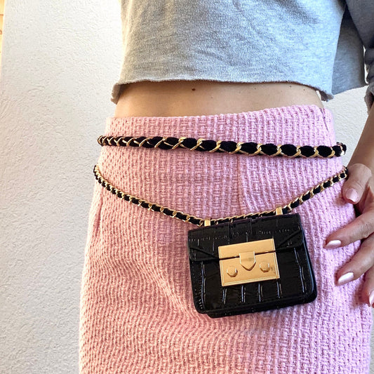BLACK SHINY MINI BAG WITH ADJUSTABLE CHAIN WAIST BELT