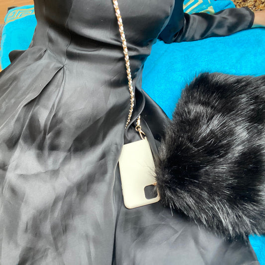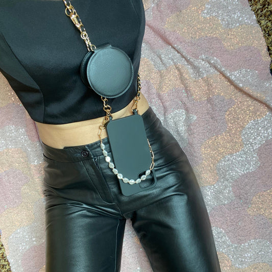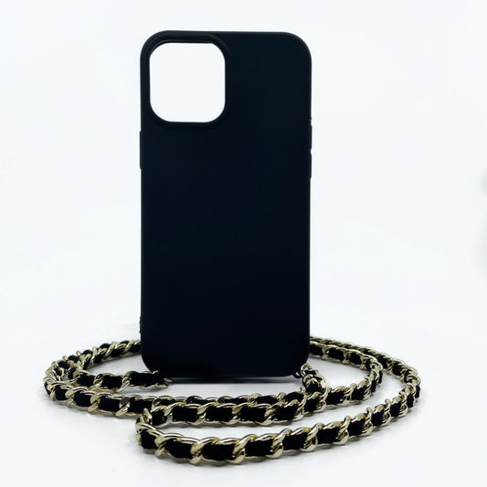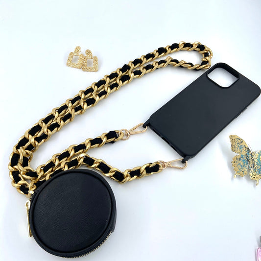 BLACK PHONE CASE WITH GOLD CHAIN LANYARD